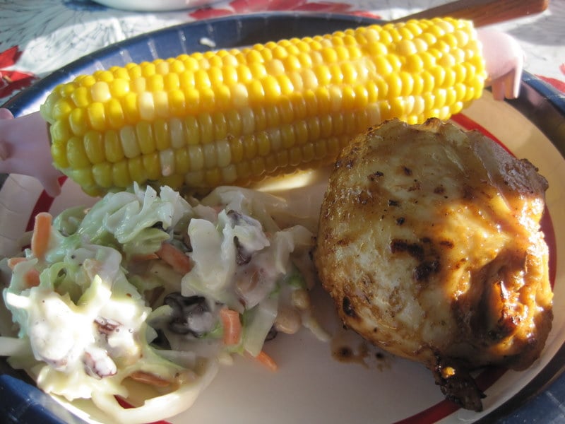 While the chicken is cooking mix up some cole slaw using a pre-packaged mix from produce section, toss with the dressing that you made and brought from home, throw in one of those small boxes of raisins and you’ve got a delicious side dish in no time. And how easy is it to boil some water for corn on the cob. Dan grilled the chicken using his Mom’s basting sauce. Gotta get that recipe. Anyway, voila, you’re dining like a camping king.