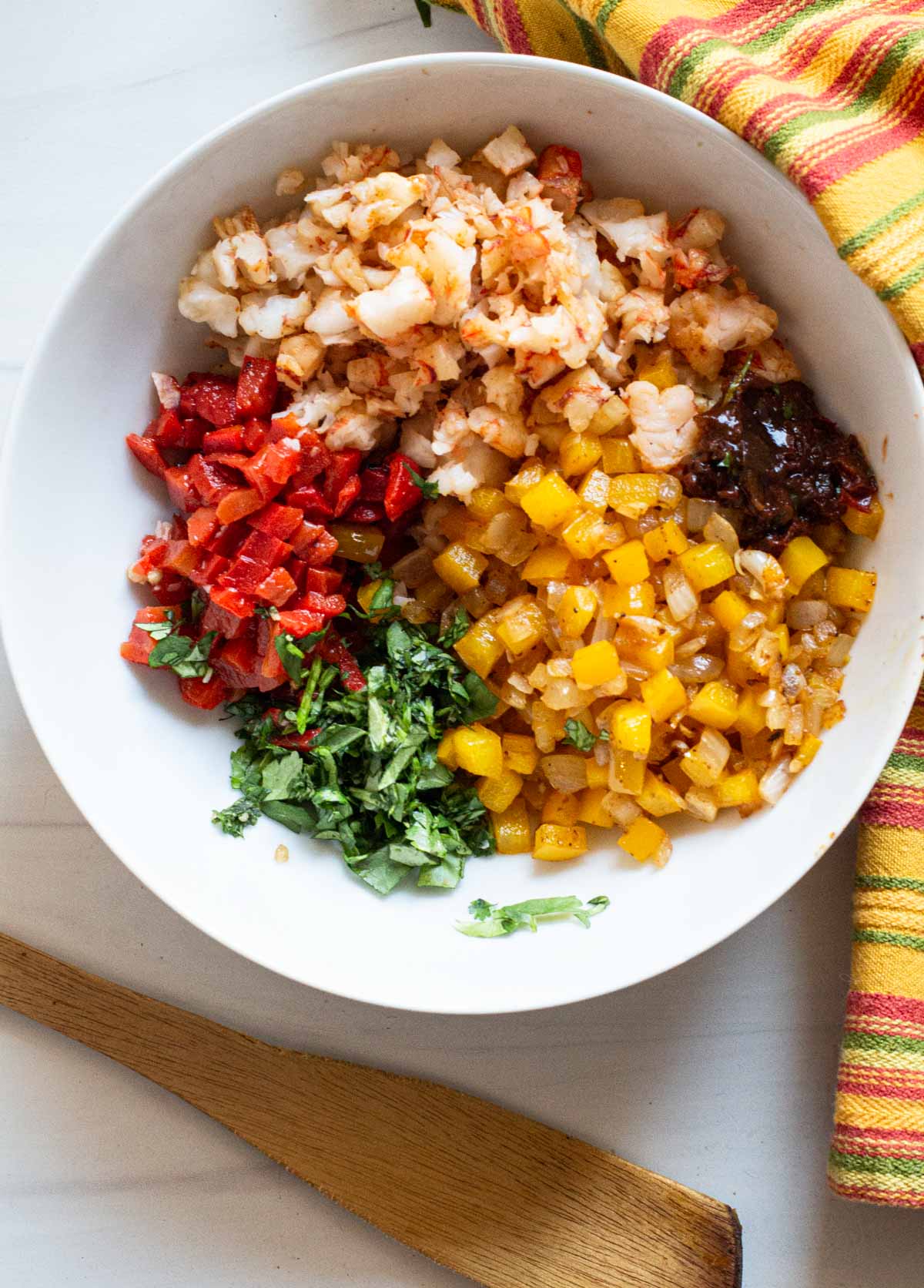 - Step 3: In a bowl, combine the sauteed onions, bell peppers, chopped roasted bell pepper, chopped cilantro and chopped chipotle peppers in adobo sauce. Add the shredded cheese and stir well.