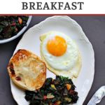 For the Eggs: During the time you’re cooking the chard, fry two eggs. Over easy is always a good choice. Serve the cooked chard next to the fried eggs. Toast, English muffins, or flat bread is a good addition.